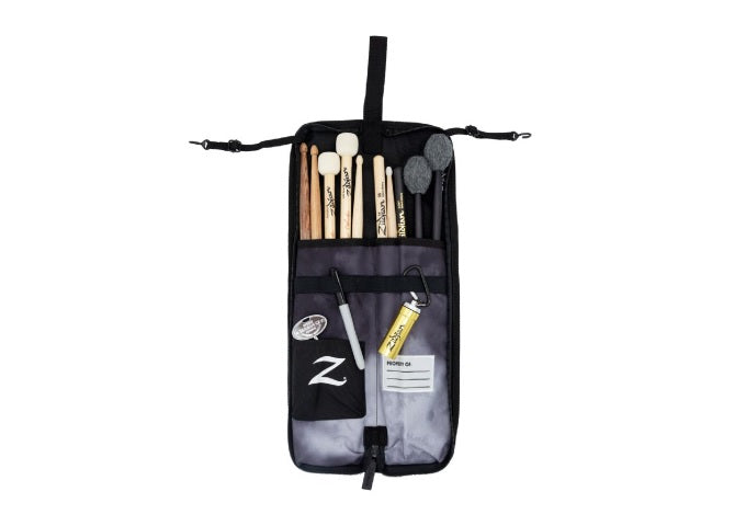 Le sac de baguettes de petite taille parfait pour aller à l'école, aux cours ou à l'entraînement. Ce sac a suffisamment d'espace pour contenir 6 paires de baguettes et offre commodité et fonctionnalité. S'accroche facilement à votre tom basse ou à votre caisse claire grâce à des sangles réglables et des crochets personnalisés. Comprend une grande poche intérieure et une sangle élastique en guirlande pour des accessoires supplémentaires. Fabriqué en nylon durable, ce sac est résistant aux intempéries et rembourré. Disponible en 3 couleurs. La dragonne de 6 pouces s'adapte aux mains plus grandes Peut contenir jusqu'à 5 paires de baguettes ou d'outils Tissu extérieur en nylon 600D rembourré et résistant à l'eau avec poches intérieures doublées en nylon Sangles de tom basse réglables avec crochets personnalisés pour maintenir le sac en sécurité lors de la suspension L'intérieur comprend une chaîne élastique pour les accessoires et une grande poche pour les clés du tambour Impression sublimée sur toute la surface en motif noir/gris ton sur ton avec logo Zildjian et petit détail de patch Z en caoutchouc