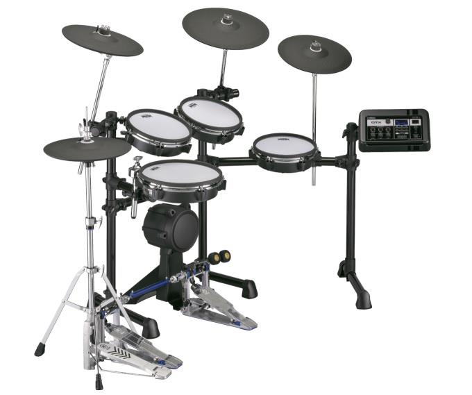 2 crash cymbals, a ride cymbal, and hi-hat cymbal provide tri-zone bow, bell, and edge effects with integrated muting and choking